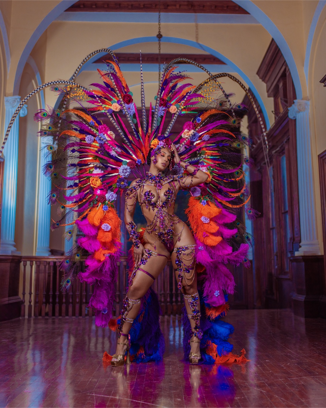 Frida blooms in vivid purples, sunset oranges, and deep blues inspired by the artist’s iconic visual identity. Rich florals and intricate beadwork celebrate her strength,